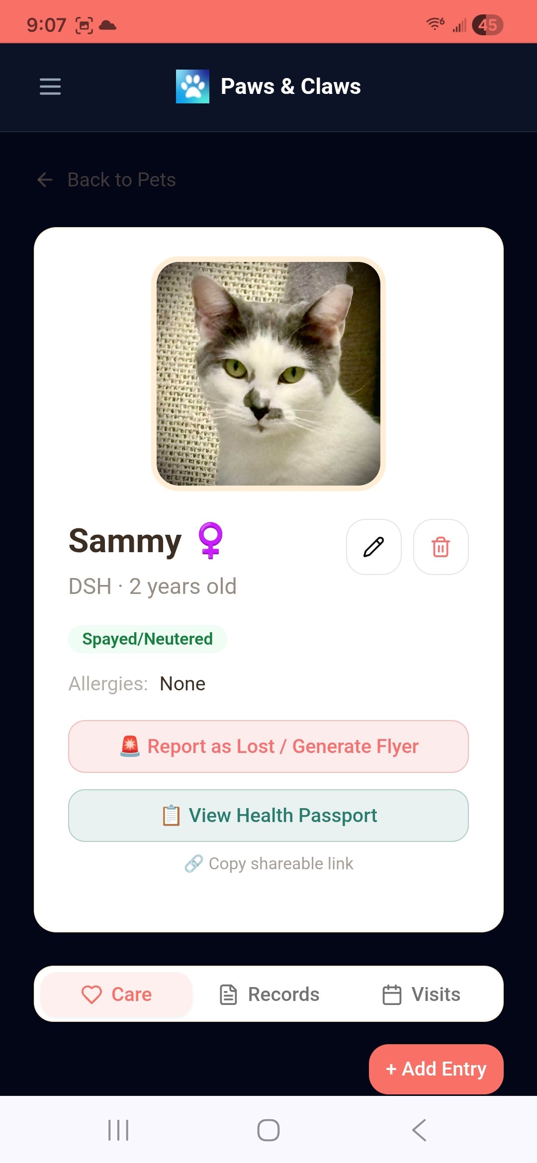 Paws & Claws is our pet health and tracking app — built for pet owners who want to stay on top of their pet's health & connect with a community when it matters most.